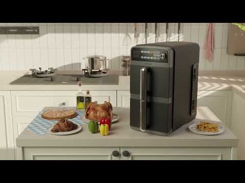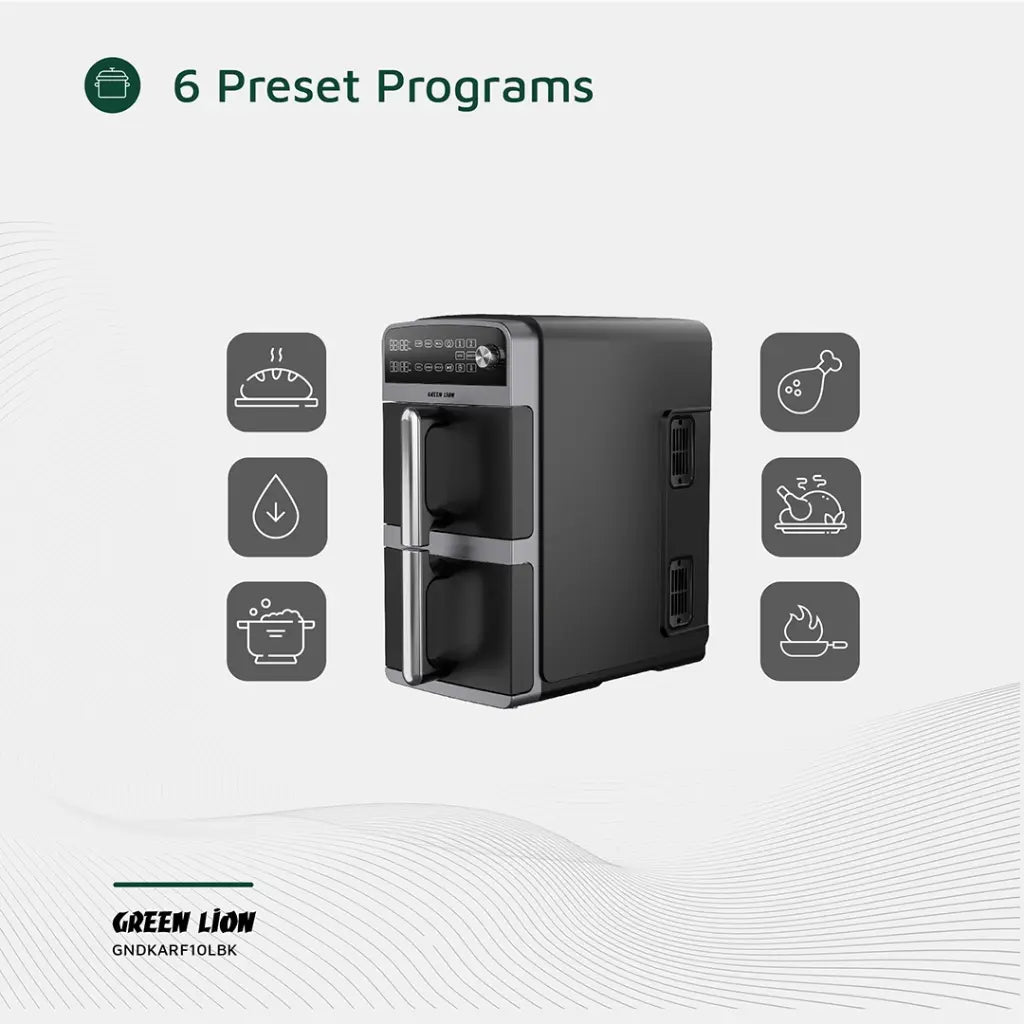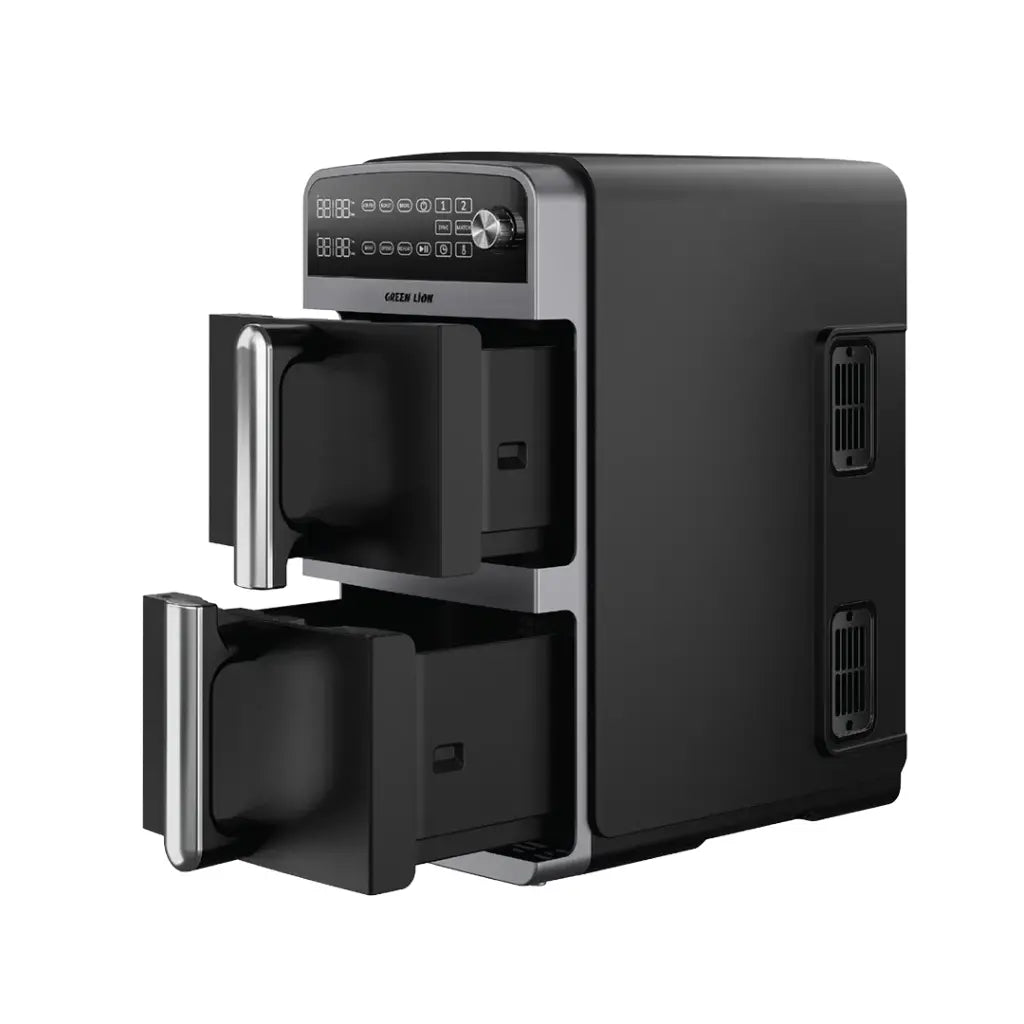 The Green Lion 10L Double-Decker Air Fryer in sleek black is the ultimate kitchen companion, designed for healthier and faster cooking. This product is equipped with a powerful 2400W motor, it comes with dual 5L compartments, allowing you to prepare two dishes simultaneously. Its intelligent functions, LED display, and touch controls make the cooking process effortless and the non-stick coating ensures easy cleaning. Accurately set the temperature from ambient to a high of 200°C and set the timer for as long as 60 minutes. This stacked meal rack provides maximum room for families or when the company visits. Each use will be fast, precise, and delicious without additional oil.