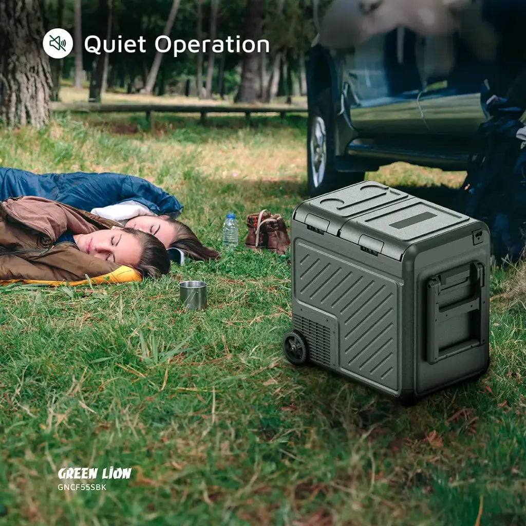 The Green Lion GFC-55 Car Fridge boasts a spacious capacity of 55L, ideal for keeping your food and drinks cool for a long drive or during some outdoor action. With a rated power output of 65W and voltage range from 100 to 240V, it is reliable to deliver great performance on the go. It features accurate temperature control and a reversible/removable door for flexible use. A child safety lock provides a safe manner of storage. Touch control displays and interior lights provide good operations in poor lighting conditions. Two shelves allow for organized storage, while the pull bar and wheels add to the convenience of portability. Whether for traveling or camping, the fridge comes with eco-friendly cooling since it is free from CFCs and HCFCs. It also features Eco and Max Speed modes to optimize energy use and cooling speed. The 3-level battery monitor helps protect your vehicle's battery, which makes Green Lion GFC-55 appropriate and reliable for any journey.