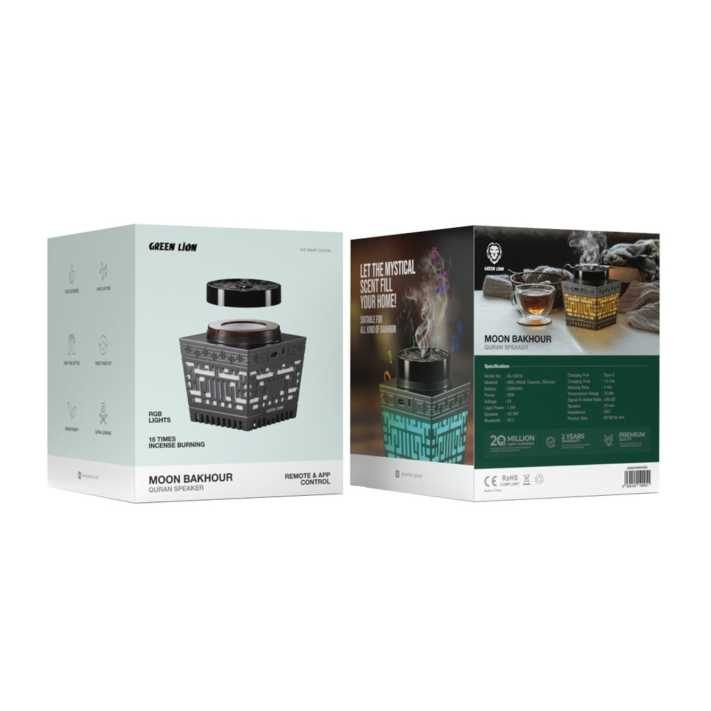 Complete the dosage of spirituality and innovation in this Green Lion Moon Bakhour Quran Speaker. Constructed with high-quality ABS, metal, ceramic, and silicon materials, the speaker is a gorgeous piece to add to an area, thus giving one a very sensational spiritual experience. Equipped with a powerful 20W output and a battery capacity of 2000mAh, it enjoys up to 5 hours of continuous playtime with one charge; it is fitted with a Type-C charging port, which only takes 5 hours for a full charge. Advanced Bluetooth V 5.1 connectivity provides a very reliable transmission range of up to 10 meters for seamless connectivity with your devices. It features an Azan time setting, timed power-off, and aromatherapy to create a tranquil ambiance. With the onboard Quran learning function, the Green Lion Moon Bakhour Quran Speaker has been an ideal accompaniment in fostering one's relationships with one's faith through the use of soothing essential oils. Take your spiritual journey to the next level with this multi-functional speaker, blending tradition with modern technology in a beautiful way.