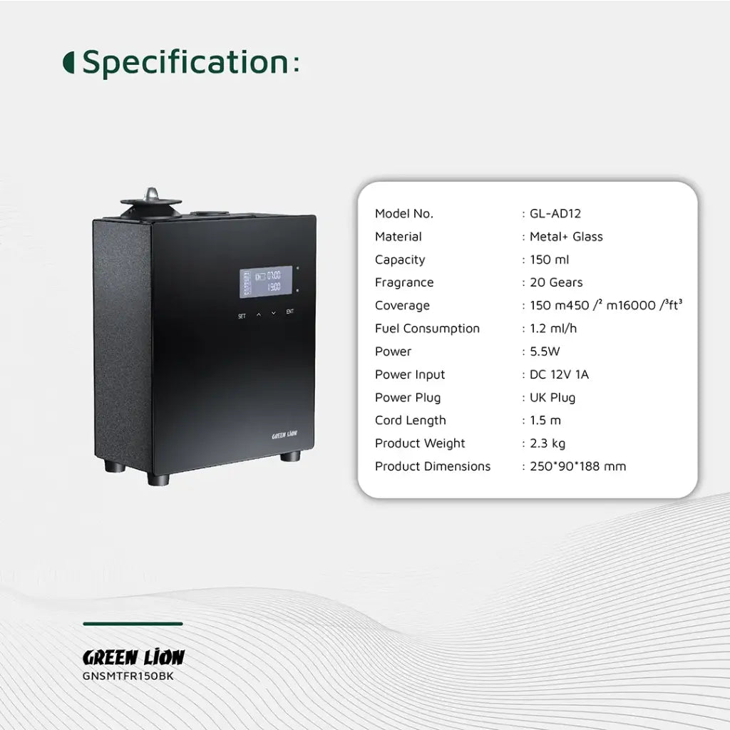 Green Lion Smart Scent Pro Fragrance Diffuser - Black is a professional-grade aromatherapy equipment suitable for domestic and business purposes. It is constructed from quality metal and glass with a 150ml capacity and 20 adjustable levels of fragrance strength to provide a customized aroma experience. It consumes 1.2 mL/h of fuel to diffuse up to 150m² (450m³/16000ft³). Smart app control, LED screen, and 5-timer setup are available for hassle-free functioning, and the quiet mode ensures interruption-free environments. With its ability to connect through HVAC, wall-mount feature, and security lock, the UK plug-driven diffuser can be an appropriate device to produce a cool climate with comfort and sophistication.