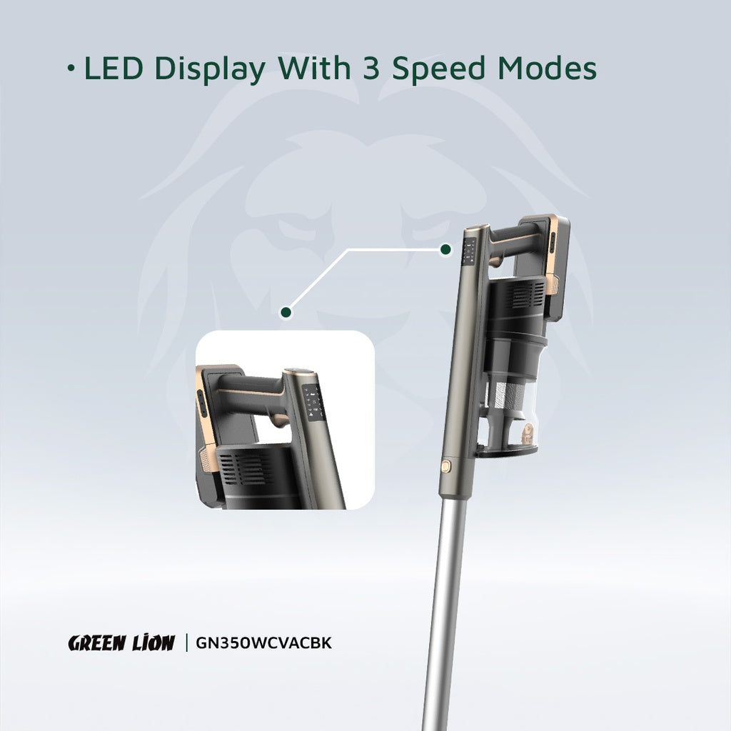The Green Lion Turbo Pro isn't just a vacuum, it's your cleaning teammate that simplifies your life with its versatile features. Transform it into a handheld cleaner to clean tight spaces like furniture and cars, leaving no dust behind. Choose from three convenient speed settings, displayed on a clear LED screen, for optimal cleaning power. Forget dirty hands! Release the dustbin with a single button for effortless emptying. Beyond its powerful performance, the Green Line Turbo Pro prioritizes your comfort. Breathe easy with a 5-stage filtration system and washable filter, saving money on replacements while ensuring clean air. The large 1.4L dust bin lets you clean for longer, while the motorized brush with built-in LED light illuminates hidden dust in dark corners. Ditch the cords with the removable battery pack and save space with the convenient wall mount.