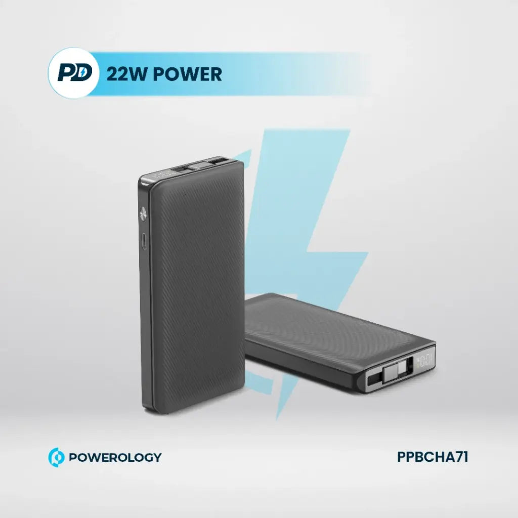 With the addition of the Powerology 10000mAh Retractable Cable Power Bank, you can now charge indoors and outdoors for power-deprived devices. With a whopping 10000mAh/38.5Wh power and a rated capacity of 5800mAh, this power bank is simply chunky and keeps your device charged even at work. The good all-in-one Type-C input/output charging mechanism supports charging with different voltage output capabilities of 5V/3A, 9V/2A, and 12V/1.5A, with a total output of 22W, thus powerful for smartphones, tablets, and above. Patented design, it also offers 2-device charging and charging in just 30 minutes: from dead to 60%. The power bank has an LED indicator that shows the amount of power left, and it has a 70cm retractable Type-C input/output cable attached to make it more convenient. Travel and daily life indeed use it as it is compact and portable. Powerology 10000mAh Rotatable Cable Power Bank takes charge at about 0C to 45C: great reliability in operation. Having this most powerful, versatile power bank, you do not have to worry about charging several devices at a time.