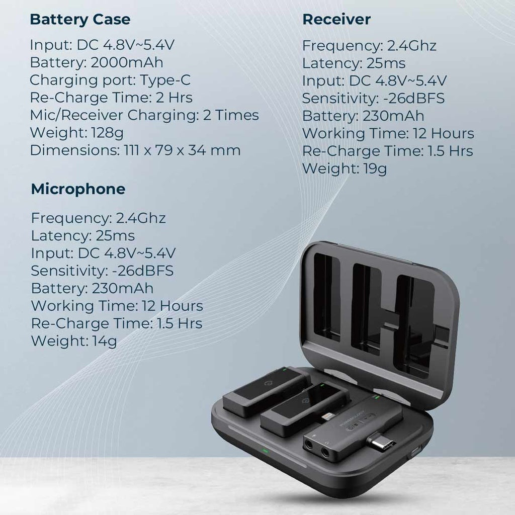 - Re-Charge Time: Microphone / Receiver 1.5 Hours Battery case 2Hours